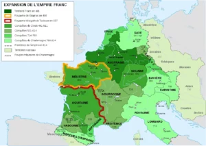 Pendant la dynastie carolingienne (751-987), commencée par Pépin le Bref et continuée avec son fils Charlemagne (742?-814) et ses successeurs, le royaume franc s’étend considérablement (voir carte) et Charlemagne devient Empereur d’Occident, intronisé par le pape, avec pour capitale Aix-la Chapelle*. Il accroît son pouvoir en vassalisant les seigneurs par des dons de fiefs, et lettré, il  fait appel à des savants pour créer des écoles ecclésiastiques qui répandent le latin savant et l’apprentissage des grands textes. La communauté juive récolte les fruits de cette période brillante, tant dans des privilèges politiques que dans les échanges d’intellectuels avec les clercs chrétiens. On trouve à sa cour des Juifs privilégiés, comme des médecins ou des diplomates comme un
