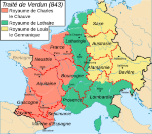 Eclatement de l’empire carolingien : après le traité de Verdun en 843, les petits-fils de Charlemagne se partagent l’Empire carolingien :