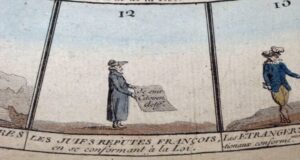 1790 En case 12 en bas « Les Juifs réputés françois en se conformant à la Loi » Le personnage en habit traditionnel tient une feuille où est écrit : « Je suis citoyen actif »